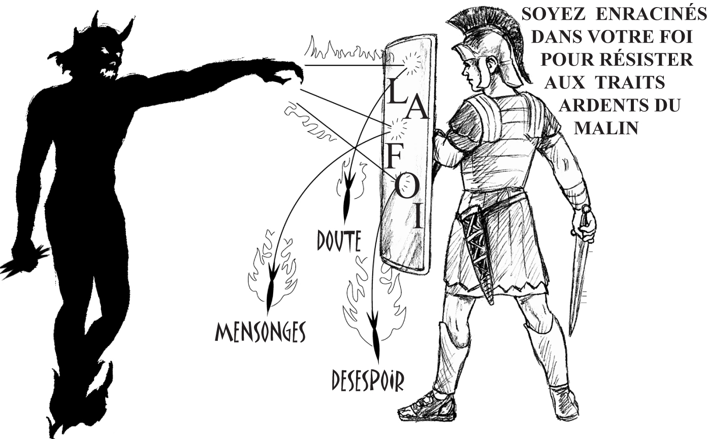 Saint Michel Archange, Défendez-nous dans le combat, soyez notre secours contre la malice et les embûches du démon. Que Dieu lui fasse sentir son empire, nous vous en supplions ! Et vous, Prince des milices célestes, précipitez en enfer, par la force divine, Satan et les autres esprits mauvais qui rôdent dans le monde pour la perte des âmes. Amen !